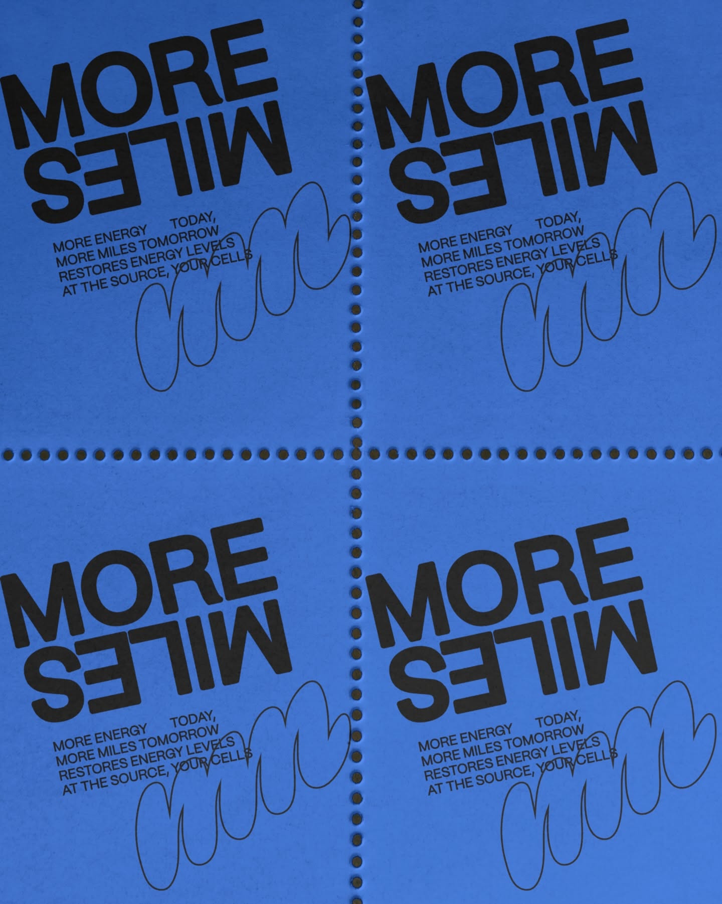 This design utilizes a stark, minimalist approach to deliver a clear environmental message. The high contrast between the dark typography and the solid blue background creates immediate visual impact and emphasizes the core concept of 'more miles.' The overall feel is direct, assertive, and clean.