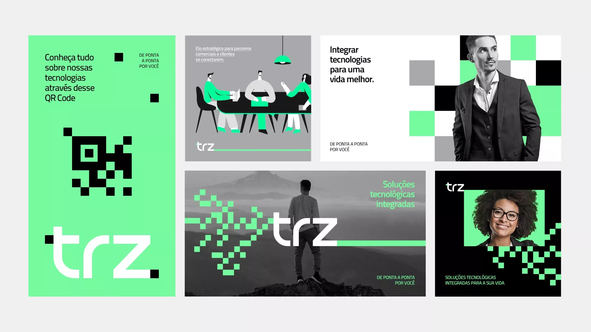 This set of graphics employs a clean, modern aesthetic characterized by strong geometric patterns and a high-contrast color scheme. The visual language is professional and innovative, using negative space effectively to highlight key information about technology integration and services.