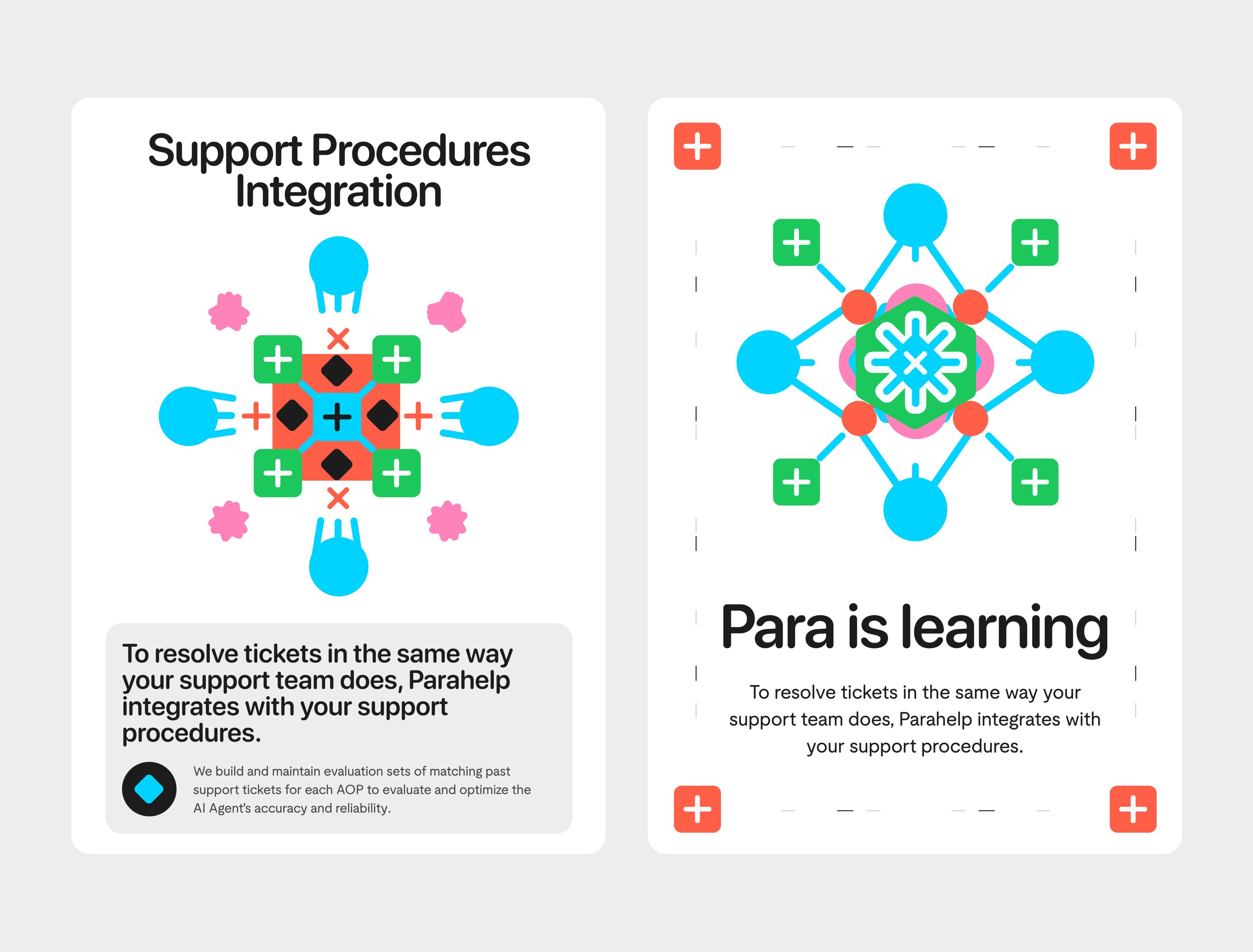 The image presents two distinct cards with a clean, modern, and technical design aesthetic. It uses simple geometric shapes and bright, contrasting colors to illustrate a process or feature related to support procedures integration. The overall feel is professional, organized, and solution-oriented.