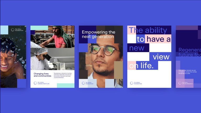 The image displays a series of cohesive, modern promotional tiles or cards, characterized by strong photographic elements and clean, minimalist text overlays. The design uses a consistent grid structure to present diverse concepts under a unified visual brand.