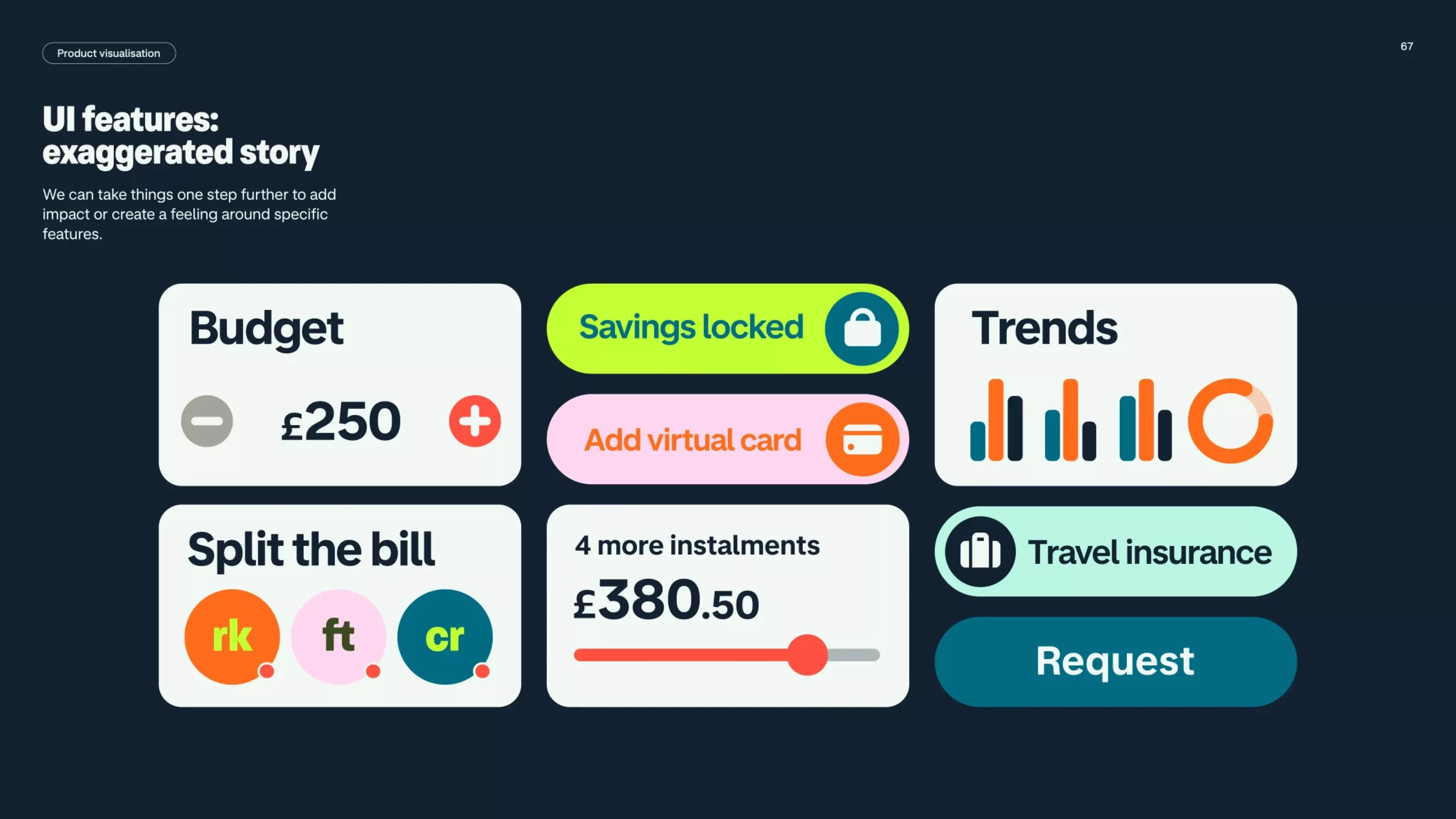 This design utilizes a dark mode aesthetic with high contrast, employing card-based components to organize various product features. The visual language is clean and modern, relying on clear iconography and vibrant accent colors to guide the user's attention through a list of functionalities.