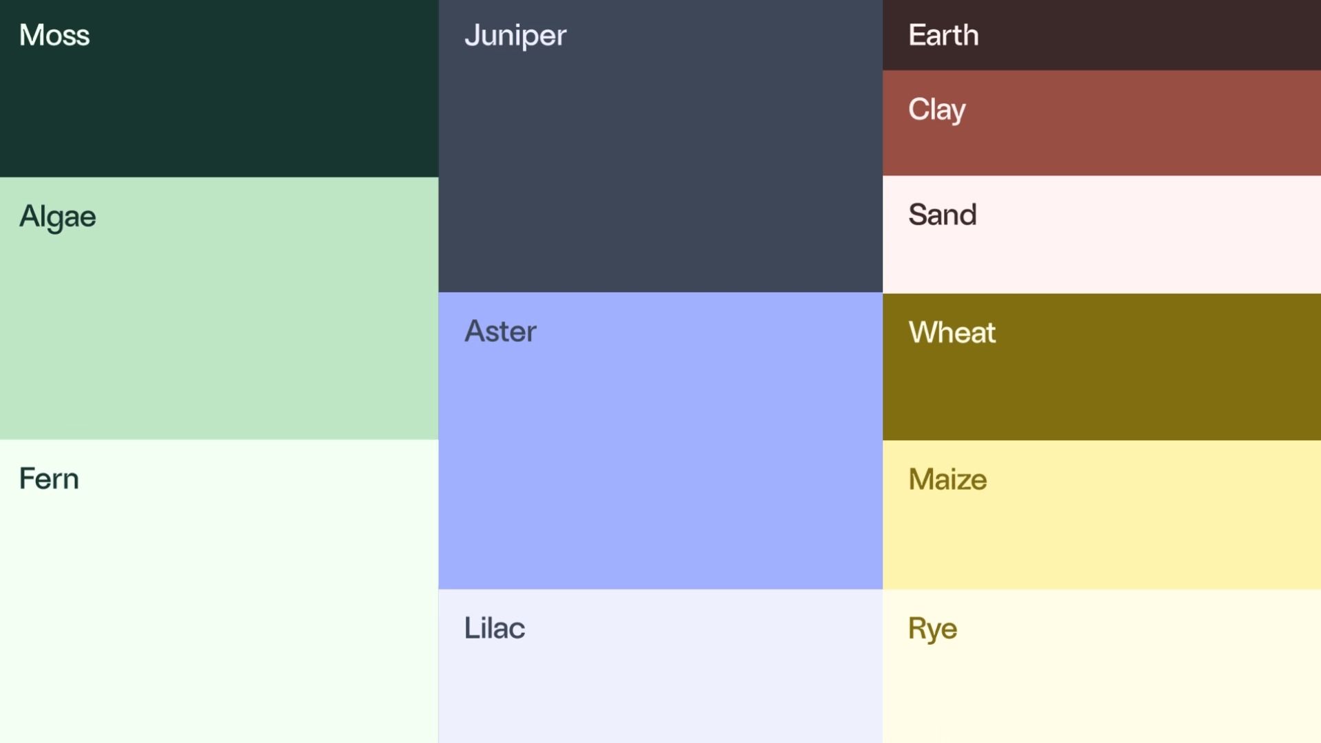 This image presents a clean, grid-based color palette featuring muted and earthy tones across various shades of green, blue, and brown. The design is highly structured and organized, suggesting a systematic categorization or data visualization.
