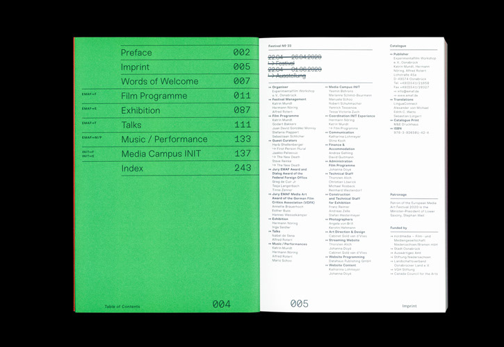 The image displays a clean, academic or institutional table of contents page characterized by a stark, minimalist design. It uses a high-contrast pairing of vibrant green and white/off-white space to organize dense textual information clearly.