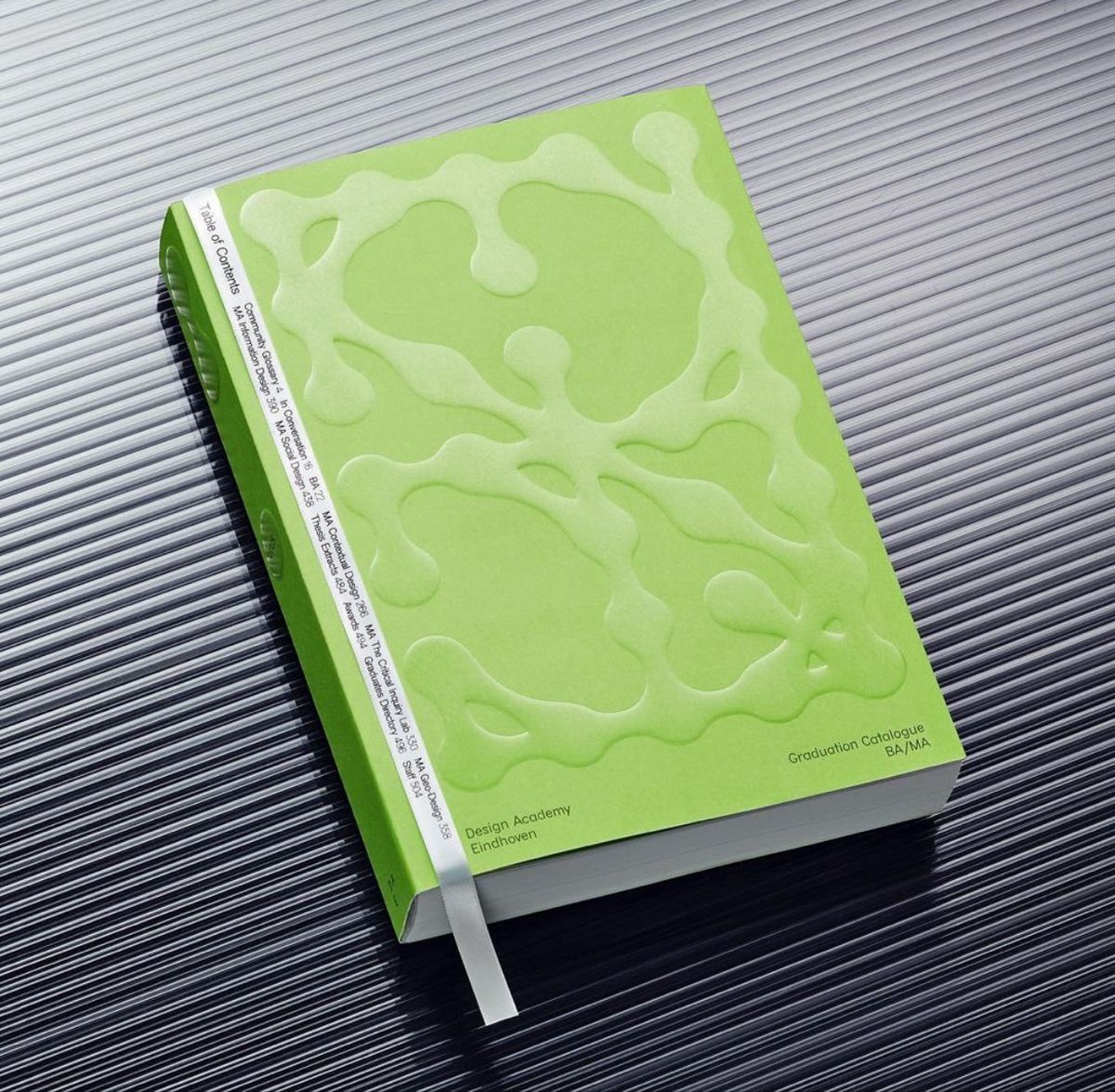 This image features a clean, minimalist design for a graduation catalogue cover, utilizing a soft, light green color and a subtle, organic embossed pattern. The overall aesthetic is professional, modern, and understated, emphasizing clarity and refined texture.