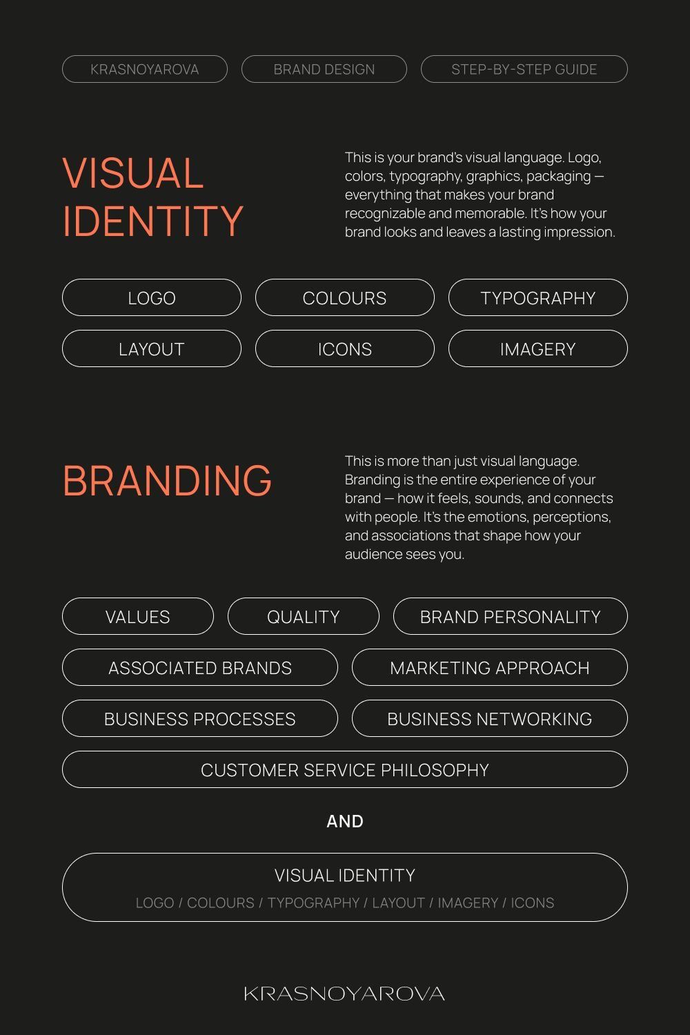 This design utilizes a stark, minimalist aesthetic with high contrast to present complex information in a highly organized manner. The visual language is clean and professional, relying heavily on negative space and clear hierarchy to guide the user through the branding concepts. The overall feel is sophisticated, authoritative, and focused on structured learning.