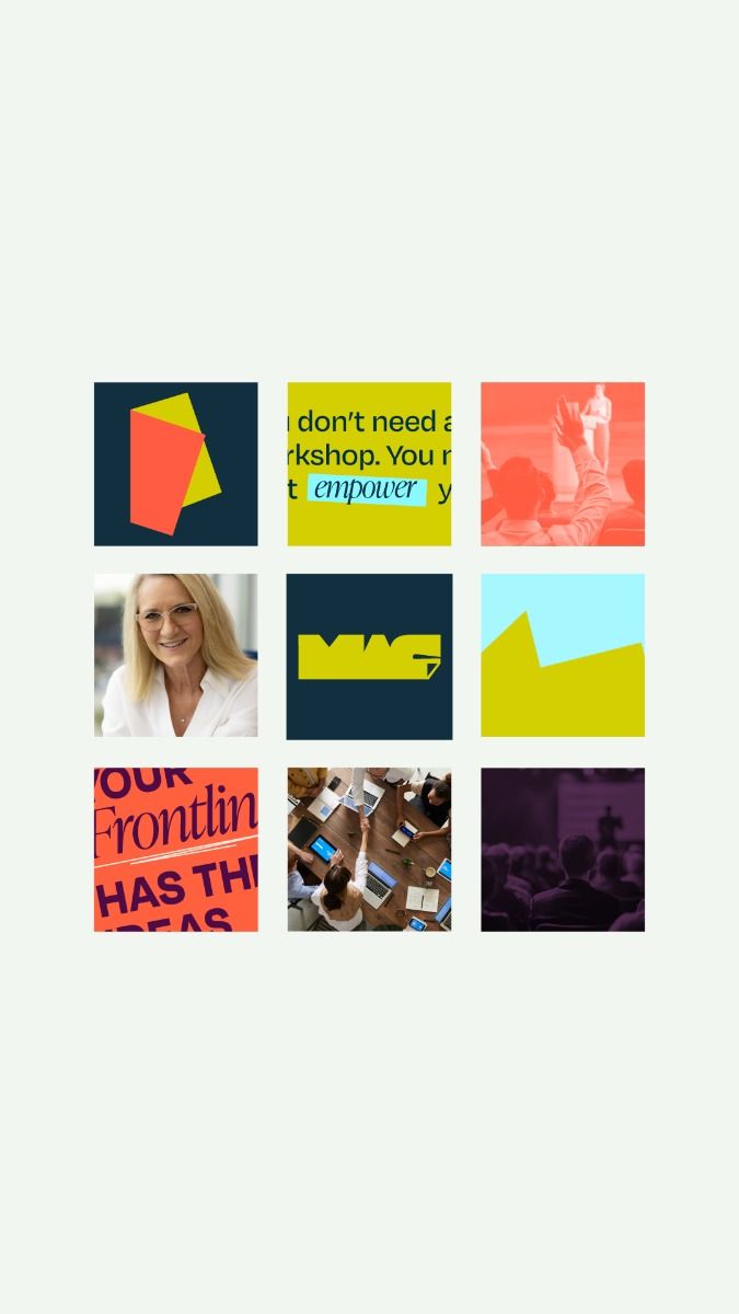 This image presents a highly structured, modular grid design utilizing bold geometric shapes and high-contrast color blocking. The visual language is modern and assertive, mixing abstract graphics with photographic elements and concise text snippets to convey a strong, confident message.