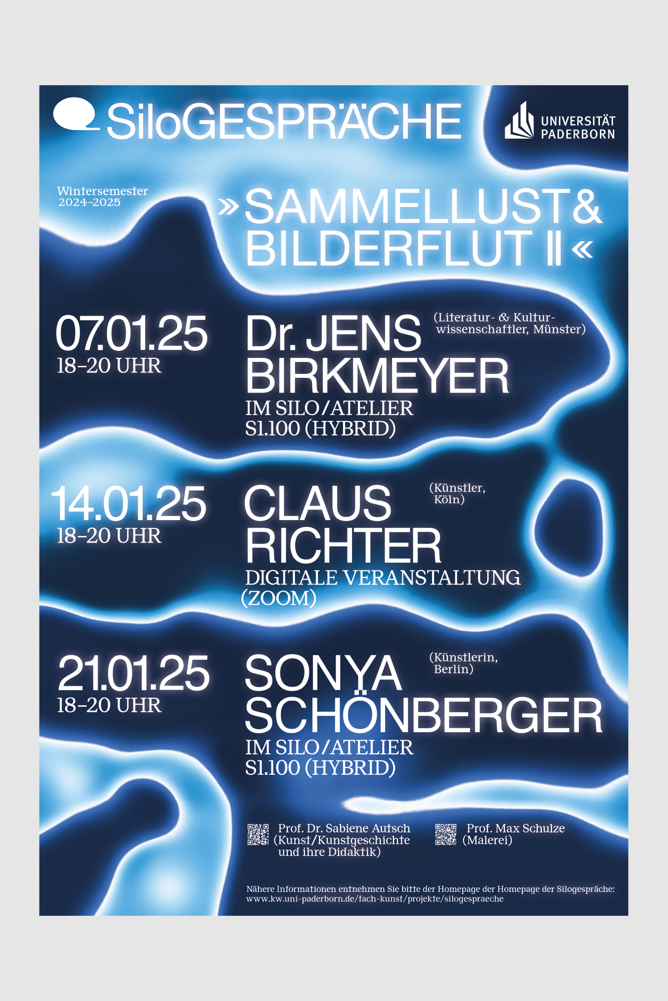 The poster employs a modern, cool-toned design dominated by deep blues and bright cyan highlights to create an ethereal, technological, and professional atmosphere. The visual language uses flowing, organic shapes that suggest connectivity or fluid movement, effectively framing the event information.