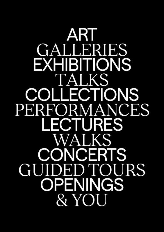 This is a stark, high-contrast typographic design featuring a vertical list of artistic and cultural activities. The layout is clean, minimalist, and relies entirely on the arrangement and weight of the text to convey information.