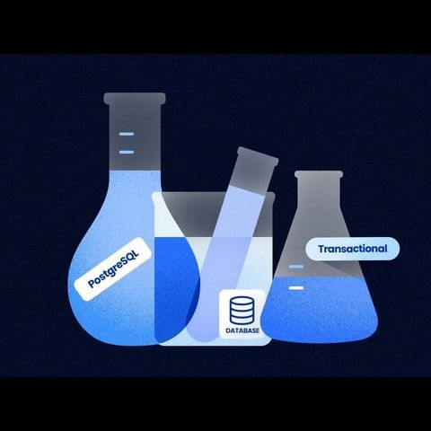 The image uses a scientific or laboratory aesthetic to represent software concepts, specifically PostgreSQL and databases. The design employs clean lines and translucent liquid representations to create a modern, conceptual visual metaphor.