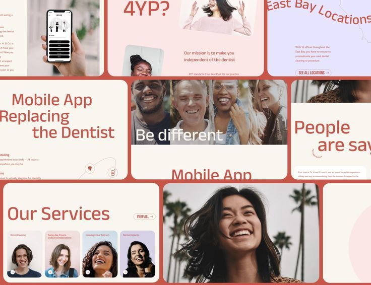 The image presents a clean, modern, and professional layout typical of a digital service or medical application. It uses ample white space and high-quality photography to convey trust and approachability, focusing on mobile app solutions for dentistry.