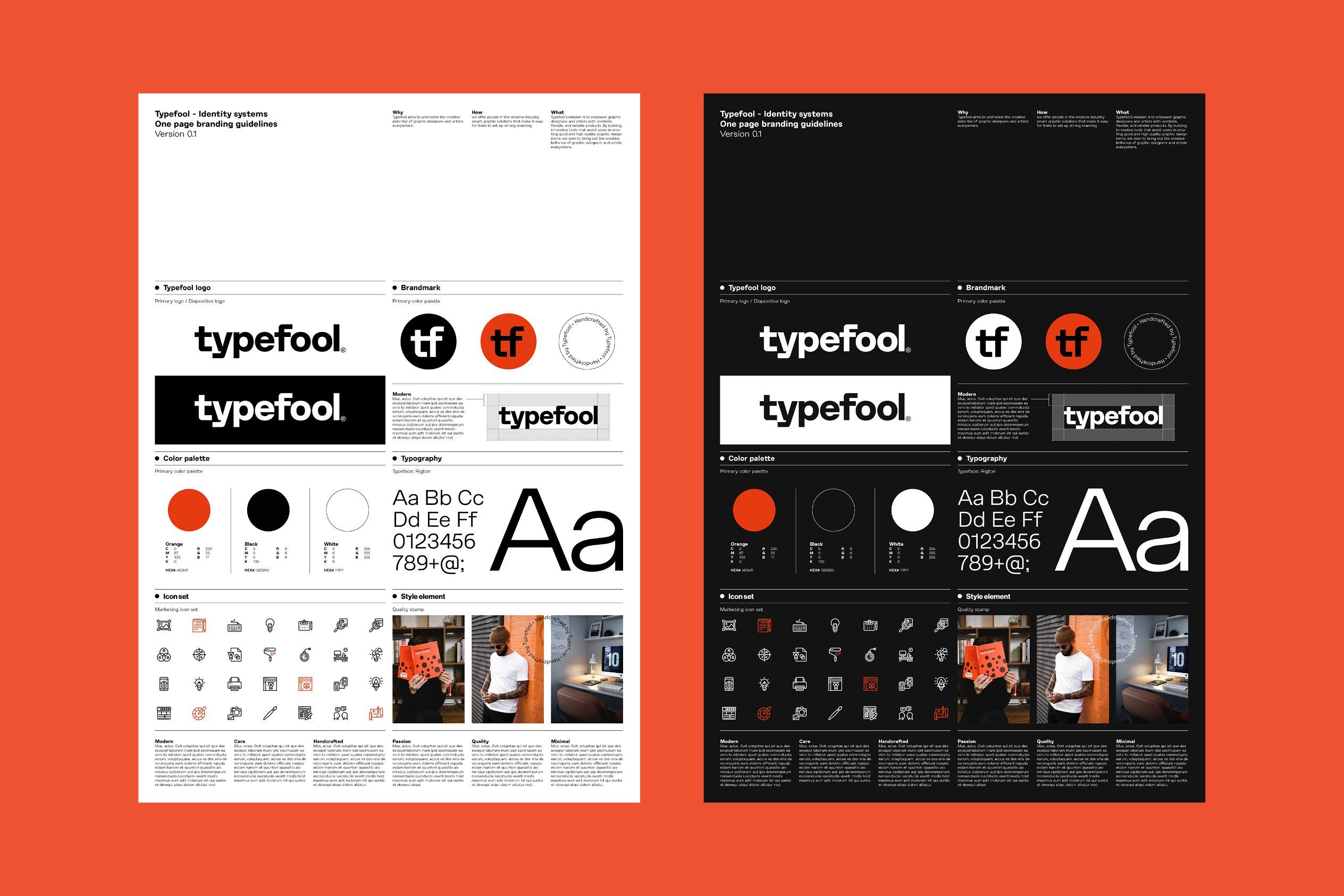 This design showcases a clean, modern approach to brand identity, heavily relying on strong typographic hierarchy and high contrast. The visual language is precise and minimalist, using stark black, white, and warm orange accents to convey professionalism and sophistication. The layout is highly structured, utilizing grids to clearly present guidelines and variations.