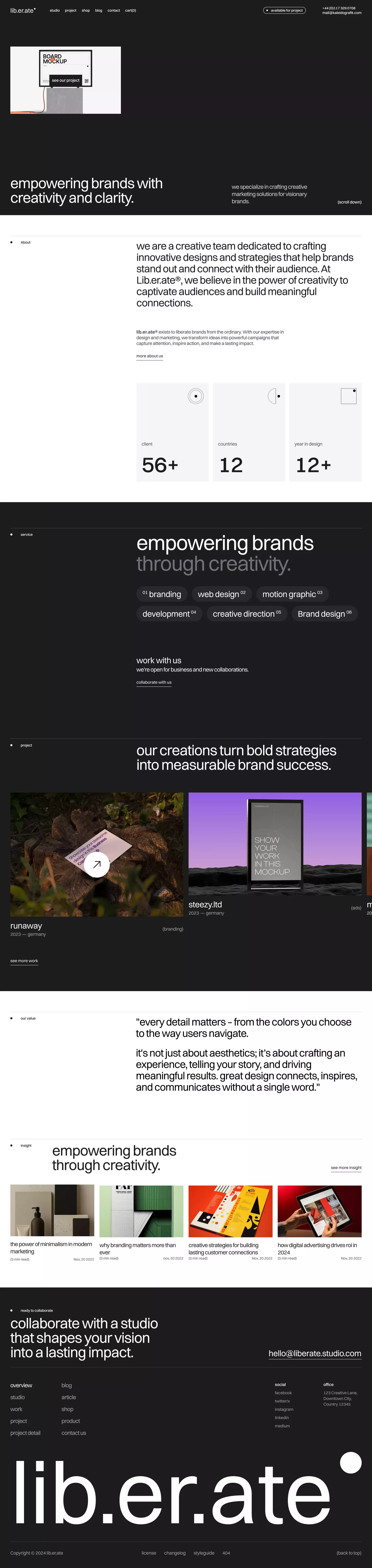 This design showcases a clean, modern aesthetic utilizing high contrast and ample negative space to emphasize key services. The visual language is professional and bold, relying on strong typography and striking imagery to convey expertise in creative services.