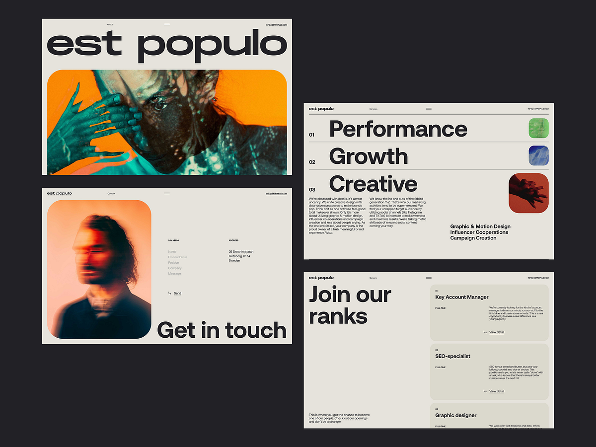 The design employs a clean, minimalist aesthetic dominated by strong typography and muted photography to convey professionalism. The visual language is modern and direct, focusing on clear hierarchy between branding, navigation, and team imagery. The overall feel is sophisticated, authentic, and highly professional.