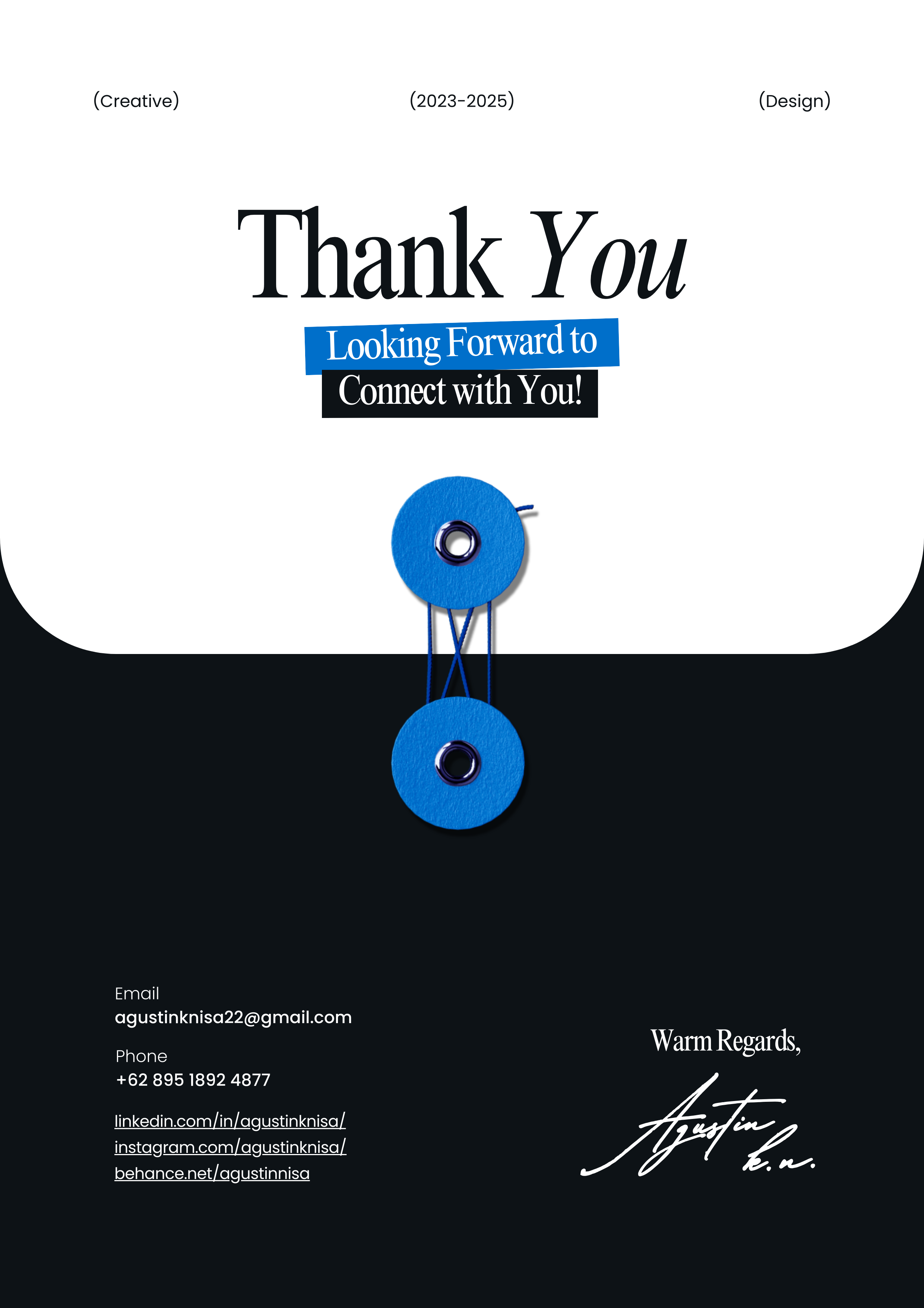 This design employs a clean, minimalist aesthetic utilizing high contrast between black text and white space, punctuated by a single pop of blue in the graphic element. The visual language is professional and direct, focusing attention on the gratitude and contact information.