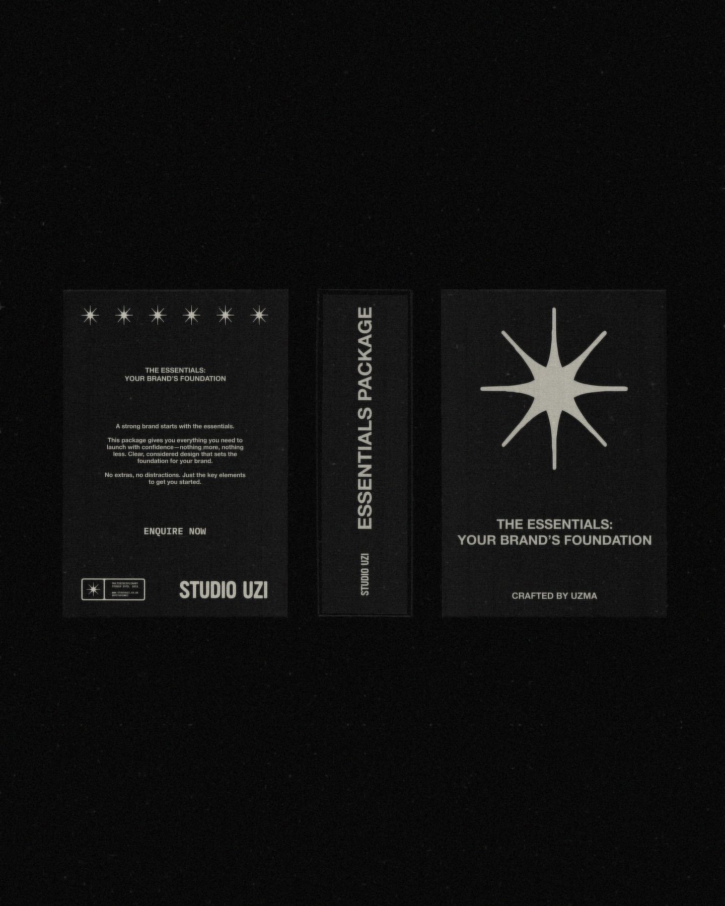 This design utilizes a stark, high-contrast minimalist aesthetic set against a deep black background. The visual language is clean and modern, relying heavily on negative space and precise typography to convey a sense of premium professionalism and focused branding.