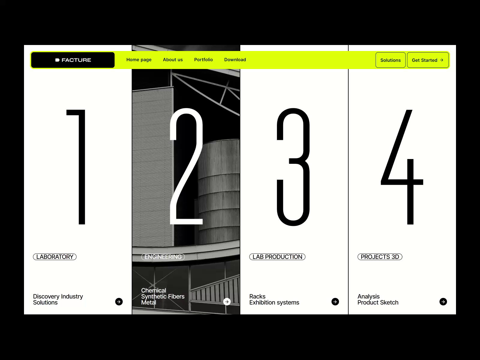 This design utilizes a stark, minimalist aesthetic dominated by large, bold numbers set against a textured, monochromatic background. The visual language is clean and technical, emphasizing structure and precision through strong typography and clear section labeling.