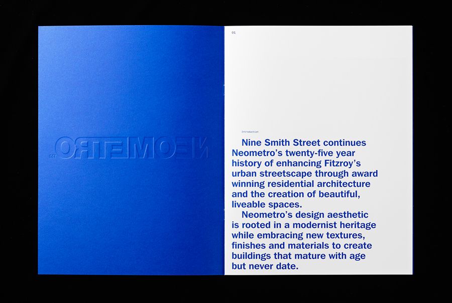 This design utilizes a stark, high-contrast split composition, pairing a deep, saturated blue field with a clean white informational panel. The visual language is minimalist and professional, emphasizing clarity and sophisticated modern design.