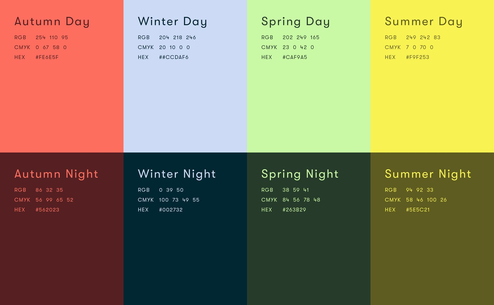 This design utilizes a clean, modular grid structure to present seasonal themes through distinct color blocks. The visual language is sophisticated and muted, relying on a harmonious blend of earthy tones and cool seasonal colors to evoke a sense of natural transition.