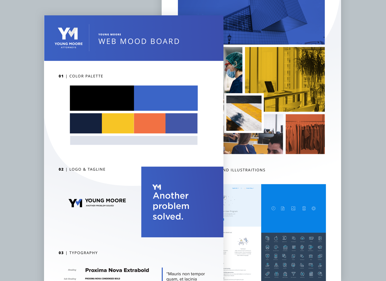 This mood board presents a clean, high-contrast, and modern visual language suitable for a contemporary brand. The design relies on strong geometric blocks of color and crisp typography to convey professionalism and energy. The overall feel is structured, bold, and highly polished.