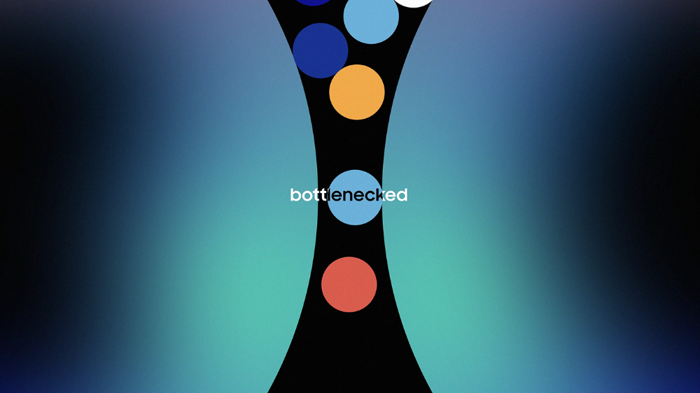 This design utilizes a strong vertical composition, featuring an abstract funnel shape composed of colored circles against a subtle gradient background. The visual language is clean and modern, effectively conveying a sense of focus or constraint through the tapering form.