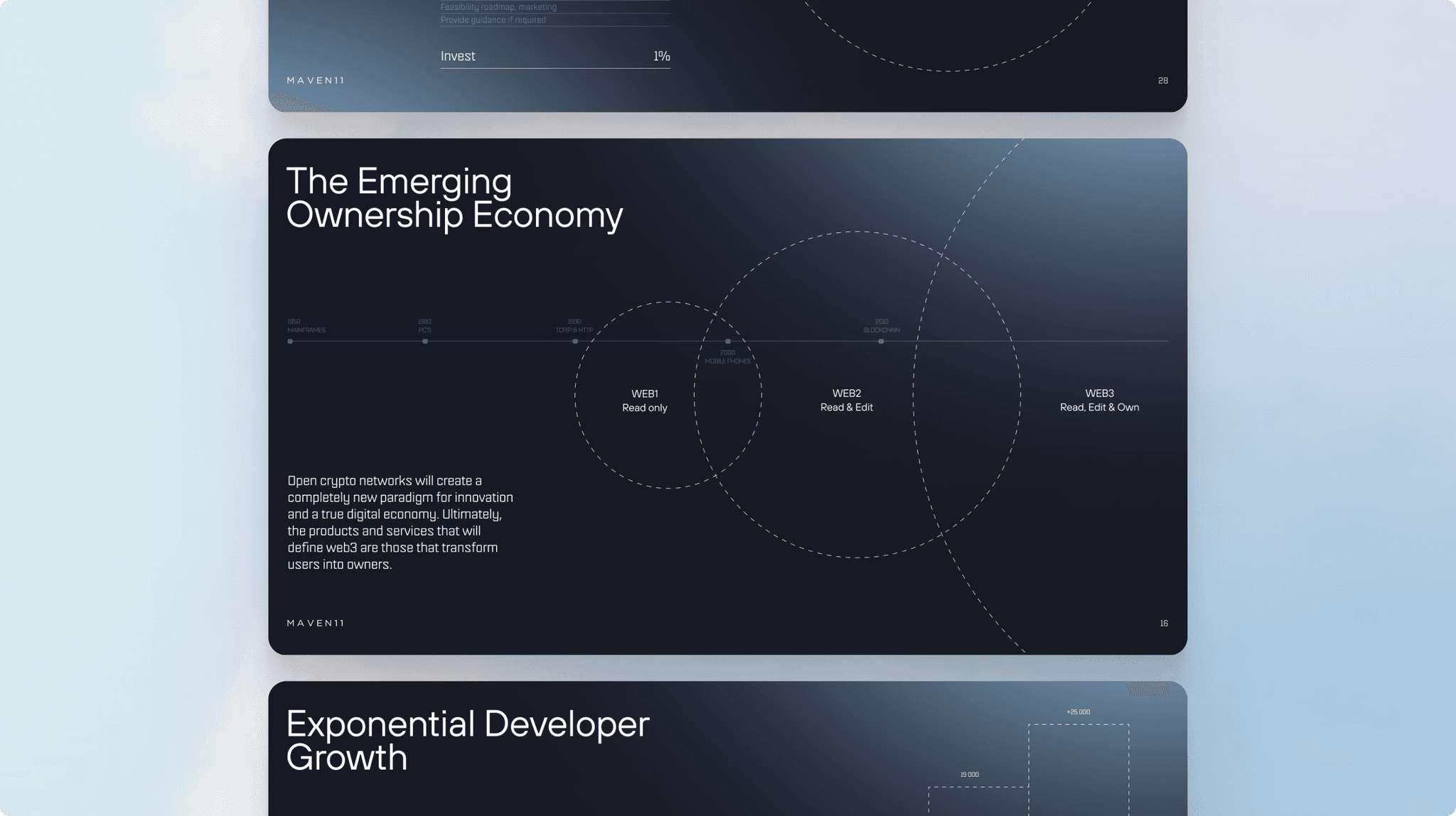 The design features a clean, dark-mode interface with subtle use of light gray and white space, employing soft, interconnected dotted lines to illustrate conceptual relationships. The overall feel is modern, professional, and data-driven, suggesting a sophisticated presentation of complex economic or technological concepts.