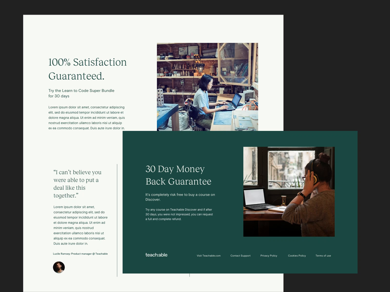 The design is clean, professional, and minimalist, utilizing ample white space to create a sense of clarity and trust. The layout is balanced, presenting distinct sections for different guarantees with clear visual hierarchy.