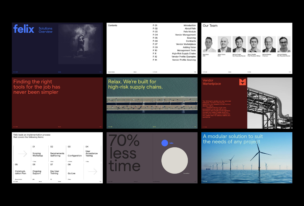 The image presents a clean, modern, and professional presentation of software or service solutions, utilizing a dark background contrasted with light text and subtle graphical elements. The design emphasizes clarity, structure, and corporate reliability through a minimalist layout.