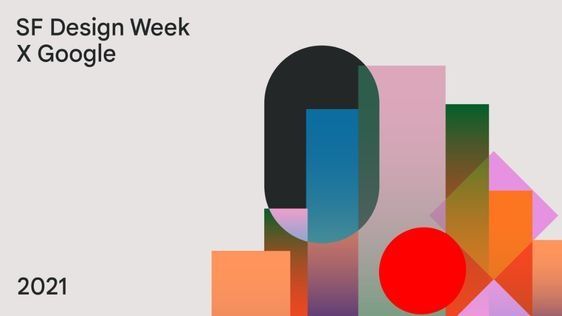 The image presents a modern, abstract graphic design featuring overlapping geometric shapes in a muted, sophisticated color palette. The composition is dynamic due to the varied sizes and solid blocks of color, suggesting a theme related to design collaboration or a specific event.