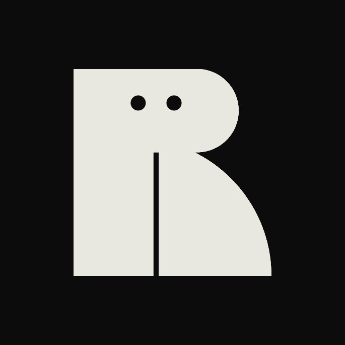 This is a minimalist, abstract representation of the letter 'R', characterized by thick, solid shapes and negative space. The design employs a stark, monochromatic approach that emphasizes form and simplicity over ornamentation.
