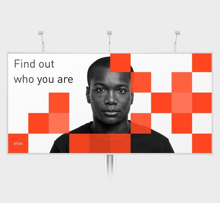 This is a striking, modern graphic featuring a portrait overlaid with a grid pattern composed of bright orange and white squares. The design uses strong geometric shapes to create visual interest while maintaining a clean, professional aesthetic.