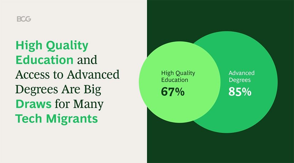 The design uses a clean, modern layout with a split background of light beige/off-white and deep green. It employs large, contrasting circles to visually represent statistics related to education access for tech migrants, creating a professional and data-driven feel.