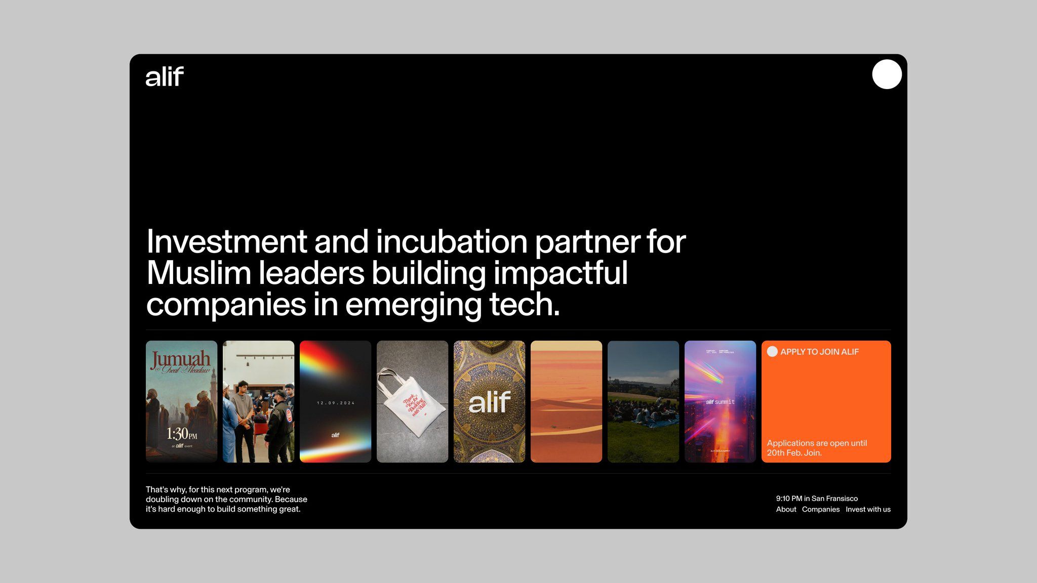 The design employs a high-contrast, dark aesthetic with minimal text to convey professionalism and seriousness. The visual language combines clean typography with warm, textured graphic elements to suggest depth and community focus. The overall feel is polished, trustworthy, and focused on high-level investment opportunities.