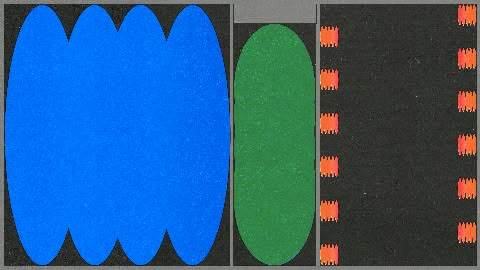 The image presents a stark, modular design featuring three distinct vertical elements: a large blue wave form, a solid green oval, and a dark field with orange markers. The visual language is abstract and graphic, suggesting data visualization or a stylized interface element.