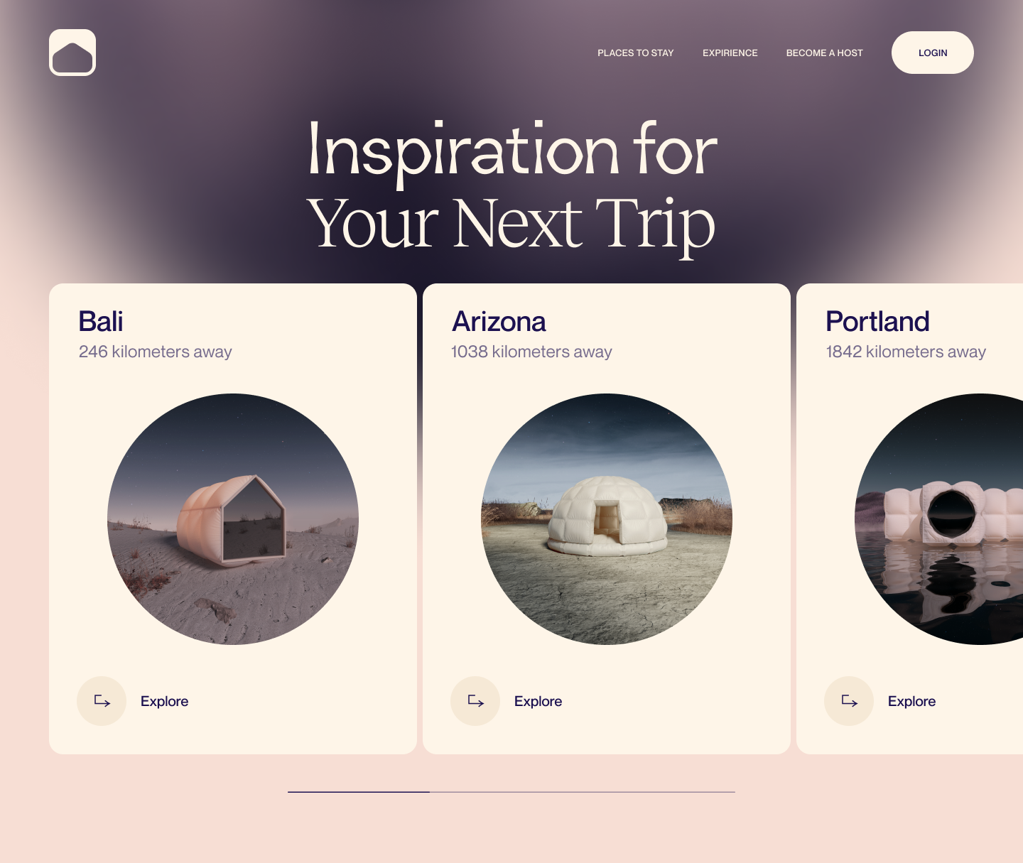 The design features a clean, minimalist aesthetic with soft, muted tones and ample white space, creating an inviting and sophisticated feel. The layout is structured using card-based components to present travel inspiration clearly and intuitively.