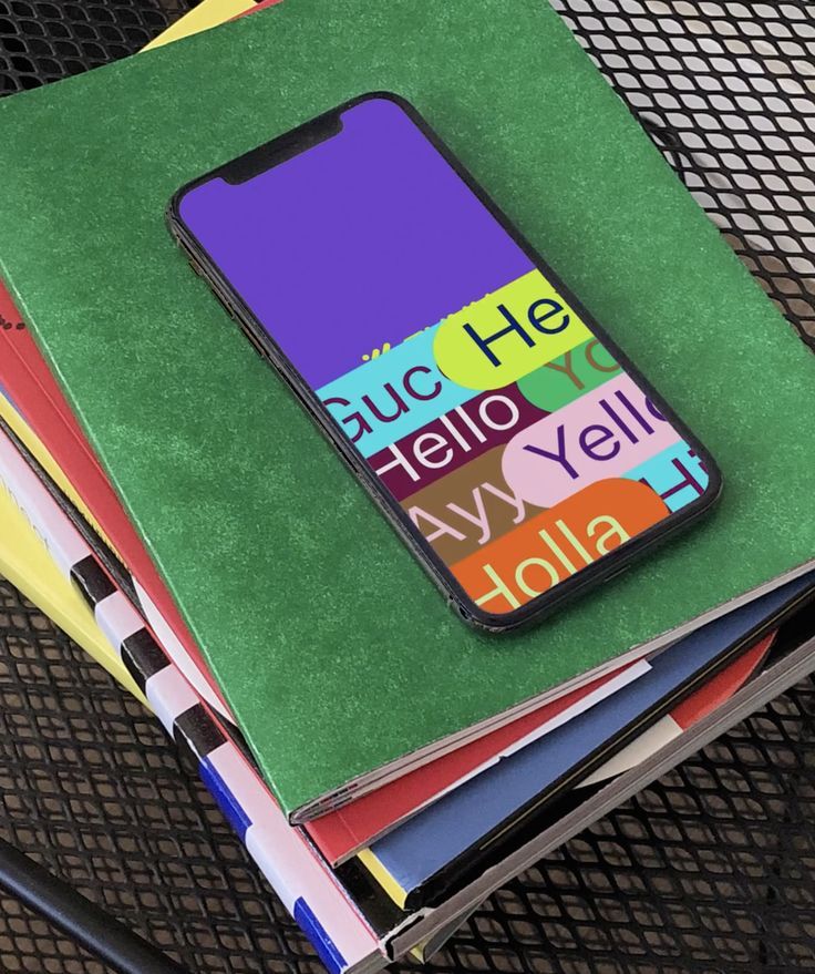 The image features a smartphone displaying colorful, handwritten-style text against a vibrant green background, resting on a stack of colorful notebooks. The composition is clean and focused, highlighting the juxtaposition between digital content and physical media.
