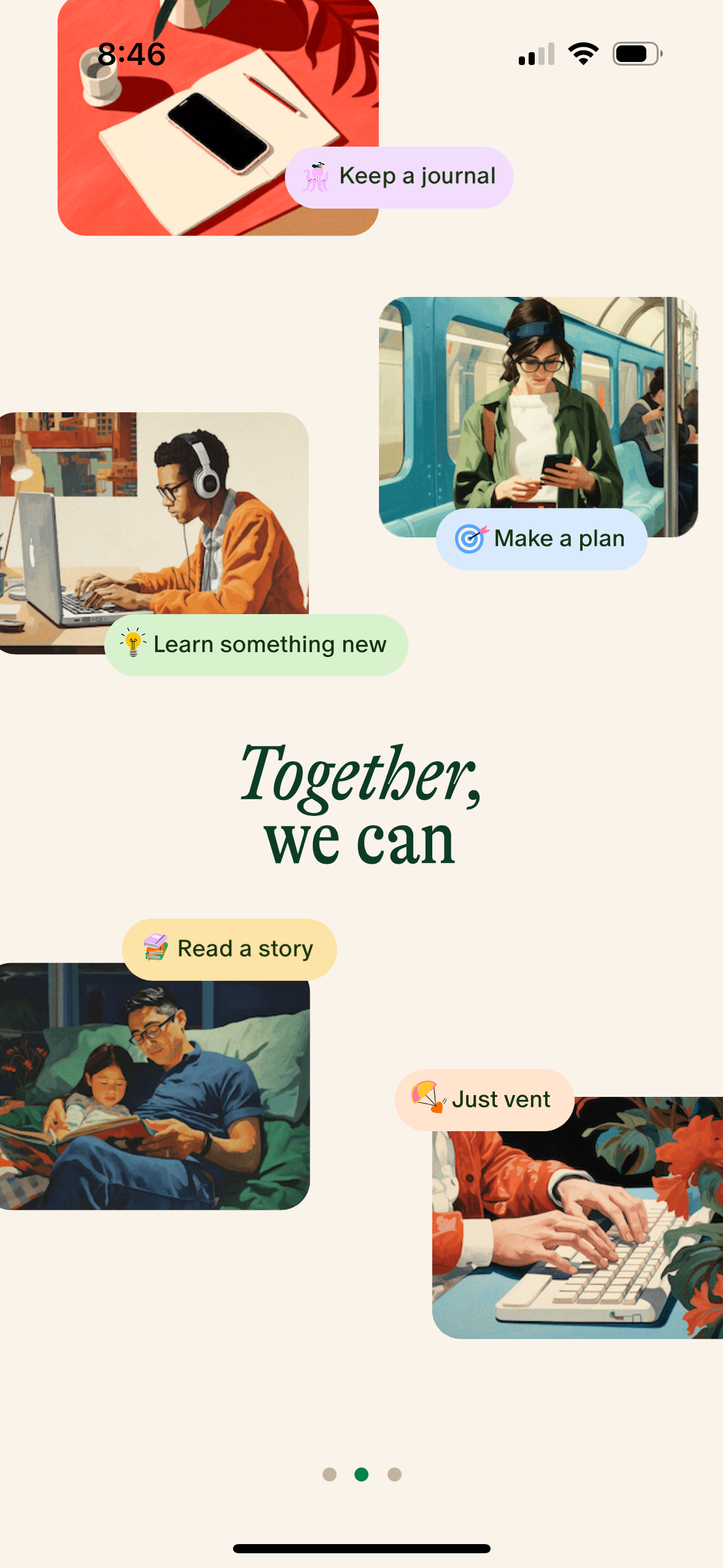 This image showcases a modular graphic design concept using text-based cards set against a natural, vibrant green background. The visual language is clean, modern, and thoughtful, emphasizing clarity through simple typography and a muted yet engaging color palette. The overall feel is calm, introspective, and educational.