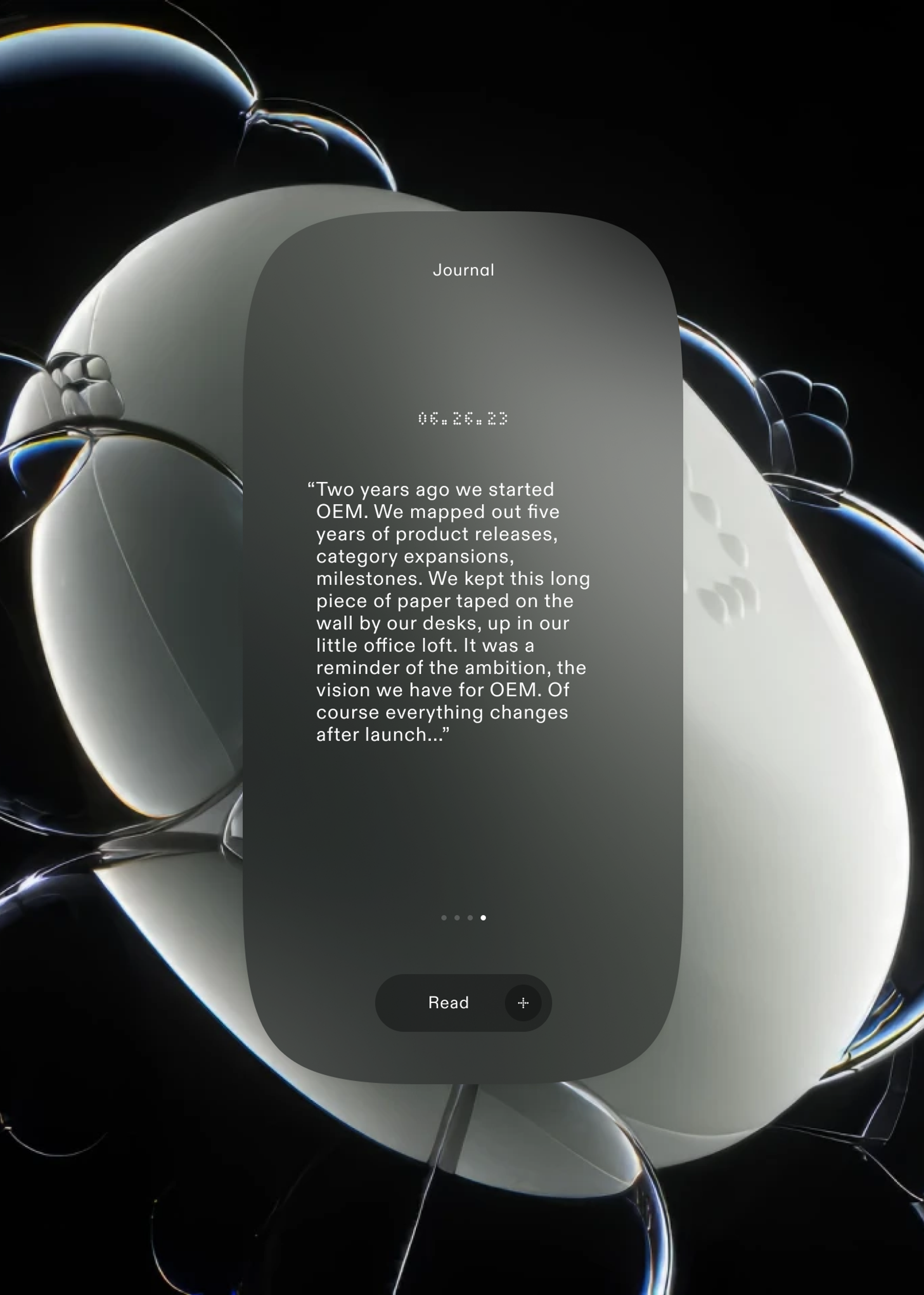 The image features a sleek, dark-toned digital interface displayed on a smooth, organic, translucent object, suggesting a modern, high-tech journaling or archival application. The visual language is minimalist and sophisticated, relying on subtle gradients and negative space to draw focus to the text content.