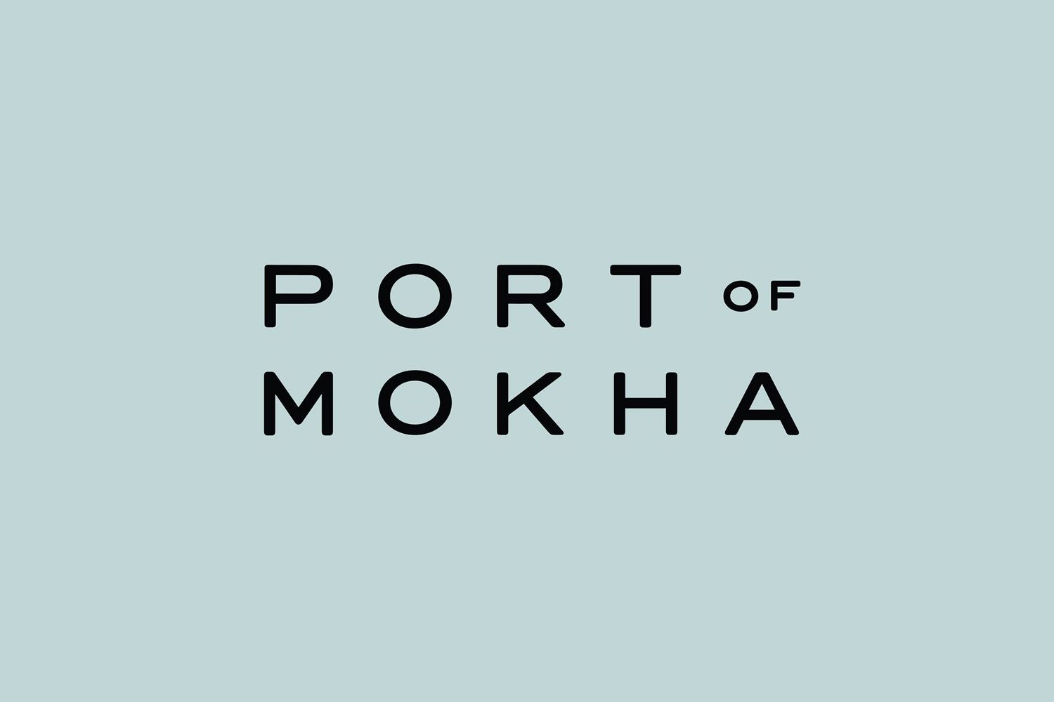 A minimalist typographic design featuring the text 'PORT OF MOKHA' in bold, geometric sans-serif letterforms against a soft, muted blue-green background. The layout is clean and contemporary, emphasizing simplicity and clarity with generous negative space.
