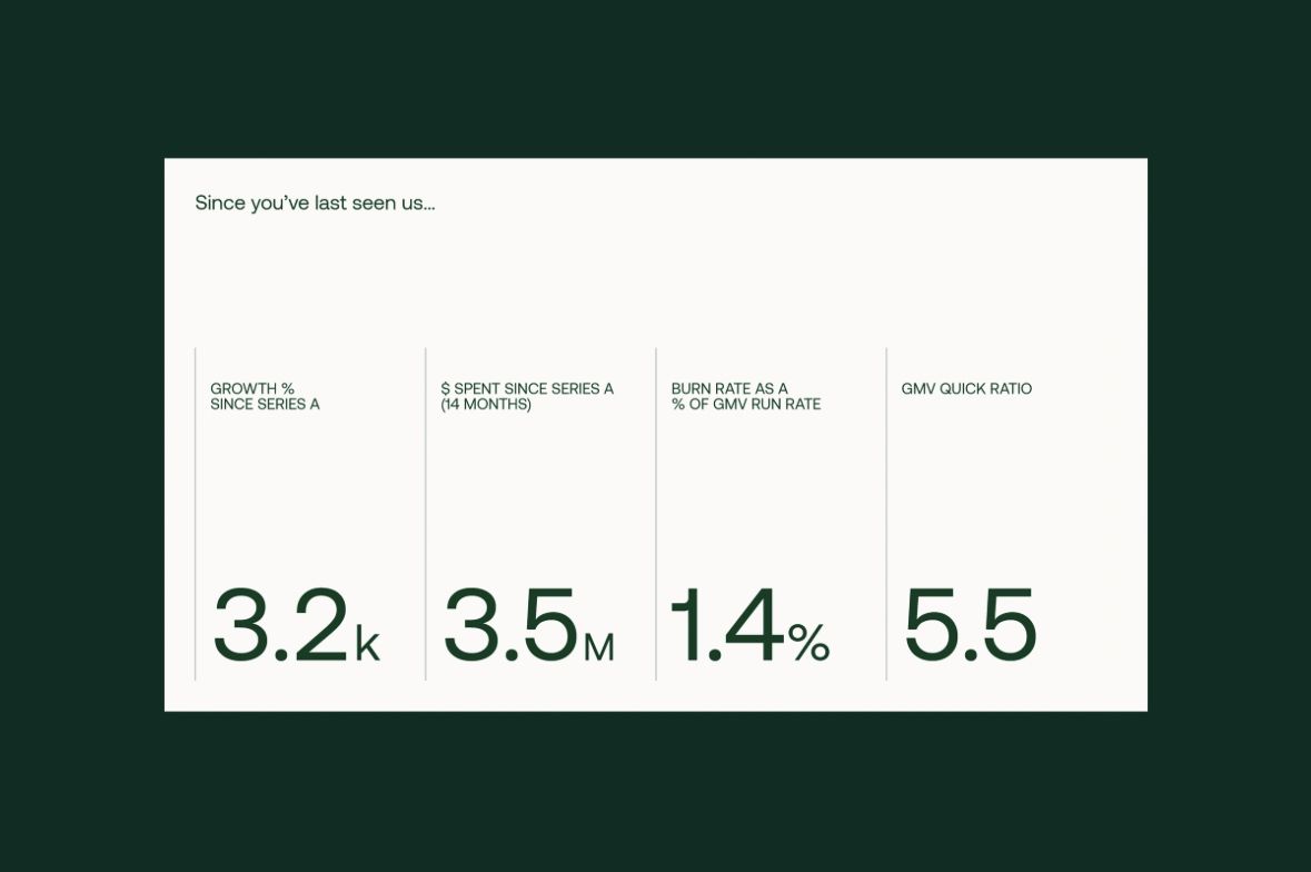 The design is clean, modern, and data-driven, utilizing a light green and white palette to present progress metrics clearly. It employs a simple bar/timeline structure to visualize fundraising achievements effectively.