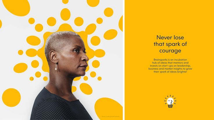 The design features a clean, modern aesthetic dominated by a vibrant yellow and white background, utilizing abstract circular shapes to create visual energy. The composition is balanced between a portrait of a woman and clear, concise text, conveying professionalism and inspiration.