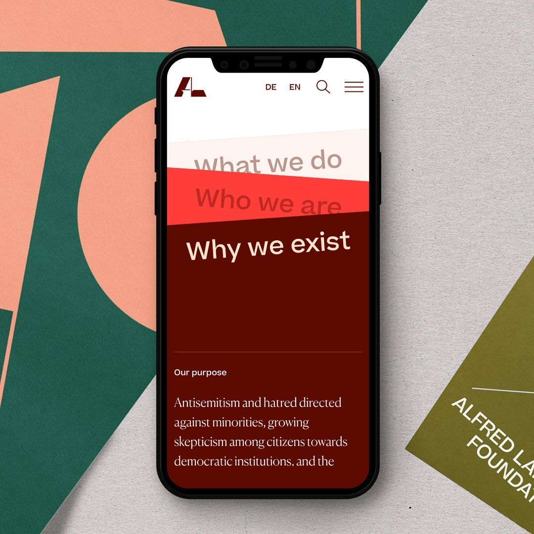 The image displays a clean, modern mobile interface design characterized by bold color blocking and clear hierarchical text. The layout uses large, distinct sections to present core organizational information in a straightforward and professional manner.