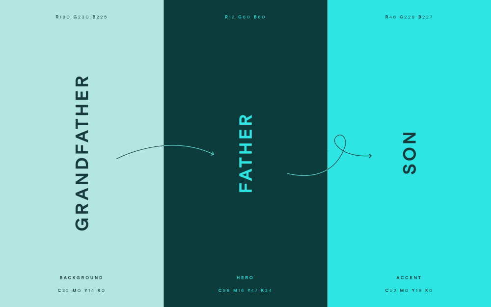 This is a minimalist and clean design utilizing a cool, muted teal/mint palette with deep forest green accents. The layout is starkly divided into three vertical sections, using negative space effectively to create a sense of balance and clear hierarchy between the concepts.