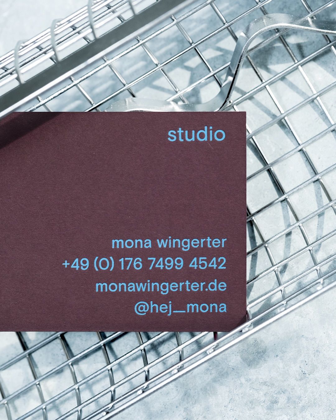 This image features a minimalist design, likely a business card or studio card, characterized by a deep, muted plum color and clean, light typography. The visual language is sophisticated and professional, relying on negative space to emphasize essential contact information.