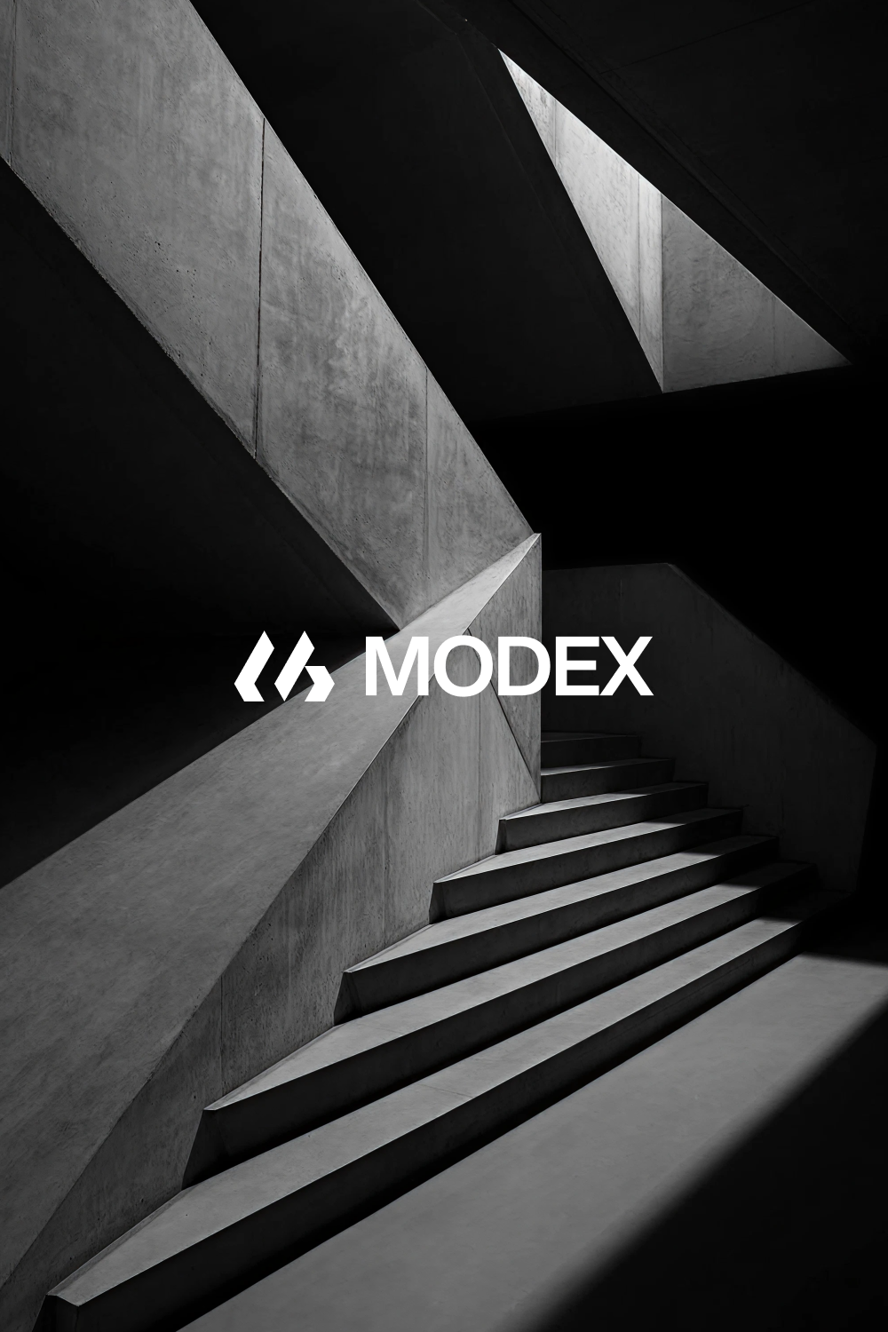 This is a stark, minimalist architectural photograph featuring strong geometric lines and deep shadows, creating a dramatic sense of depth and modern sophistication. The visual language relies heavily on negative space and the interplay between light and shadow to sculpt the concrete surfaces.