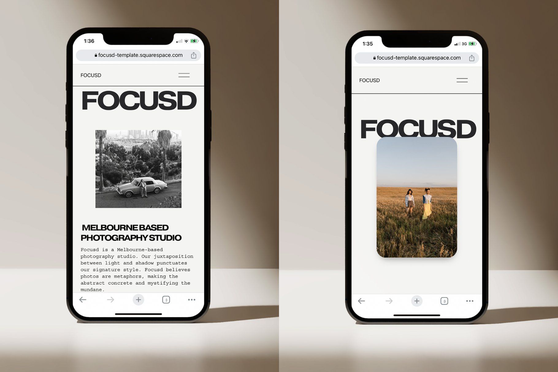 The image displays a clean, minimalist interface design, likely from a mobile application or gallery, featuring two side-by-side photographic previews. The design emphasizes high contrast and a dark theme, suggesting a focus on visual content presentation.