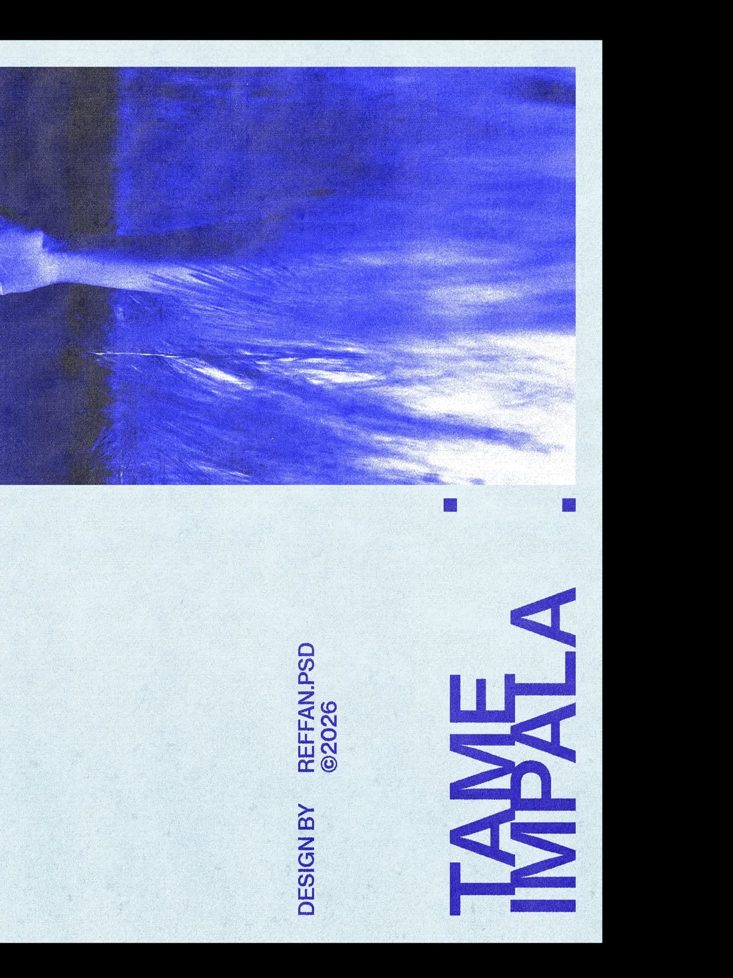 This design features a bold, high-contrast typographic treatment dominated by black and bright cyan/blue, creating a modern and graphic aesthetic. The composition is strong, using negative space effectively to highlight the featured elements like the portrait and text.