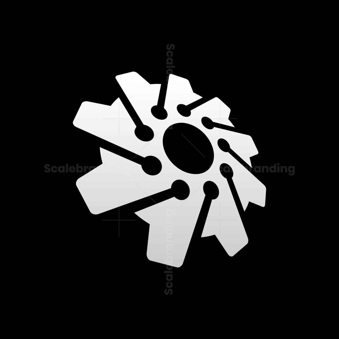 This is a clean, high-contrast icon representing a mechanical gear or cogwheel. The design uses geometric precision and negative space effectively to convey concepts of process, functionality, and industry. The visual language is stark and purely symbolic.
