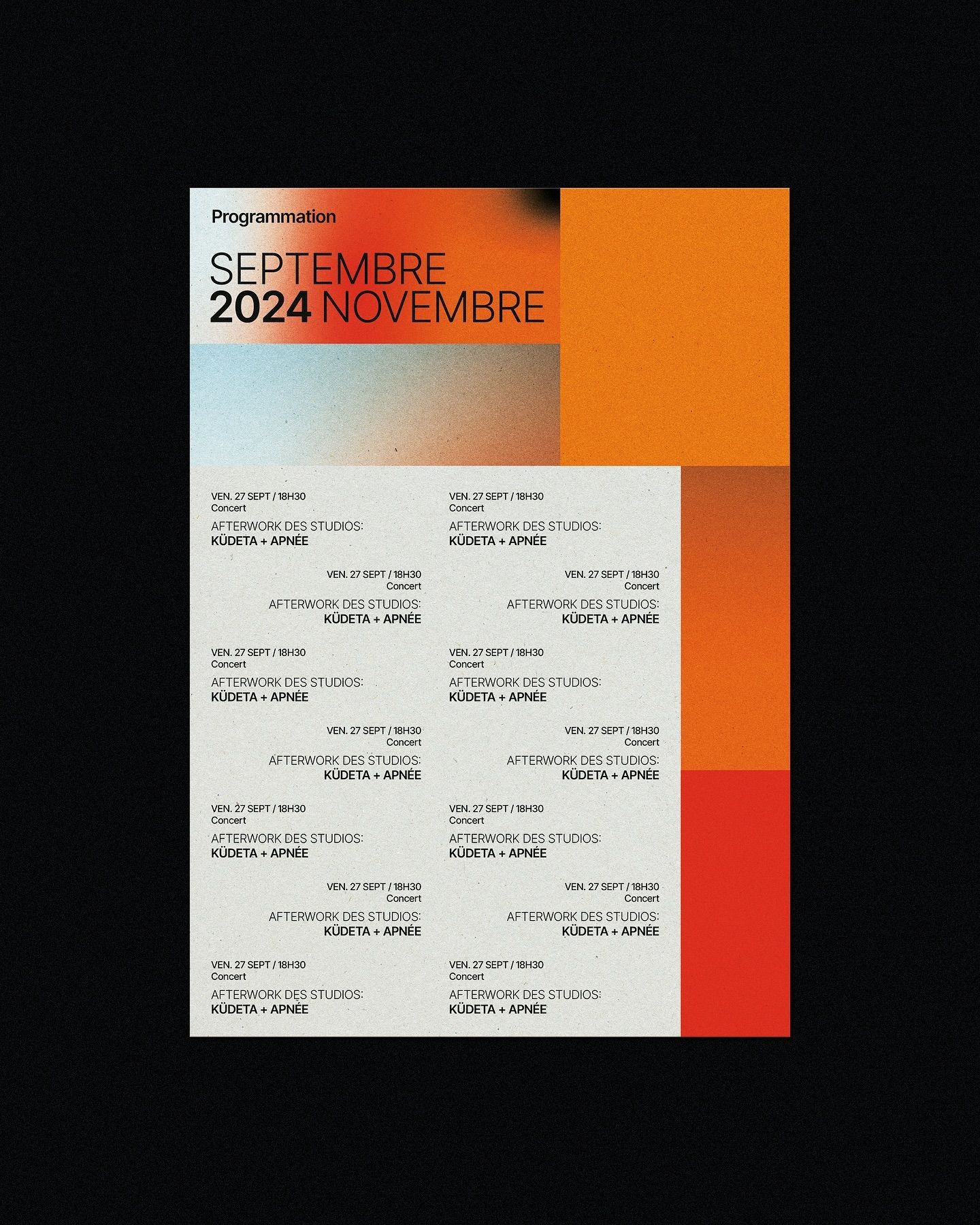 The design is a stark, modern typographic poster utilizing a high-contrast color scheme dominated by black, white/light gray, and a vibrant orange. It employs a clean, structured layout to present event information clearly and formally.
