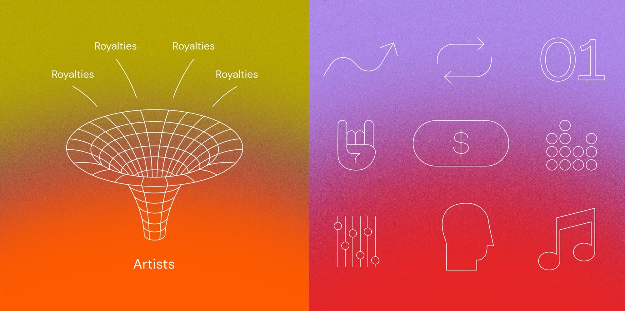 The image features a split design, using warm and cool tones to separate two distinct sections. The left side uses an organic, radiating pattern to symbolize royalties flowing from artists, while the right side presents minimalist icons against a vibrant gradient background.