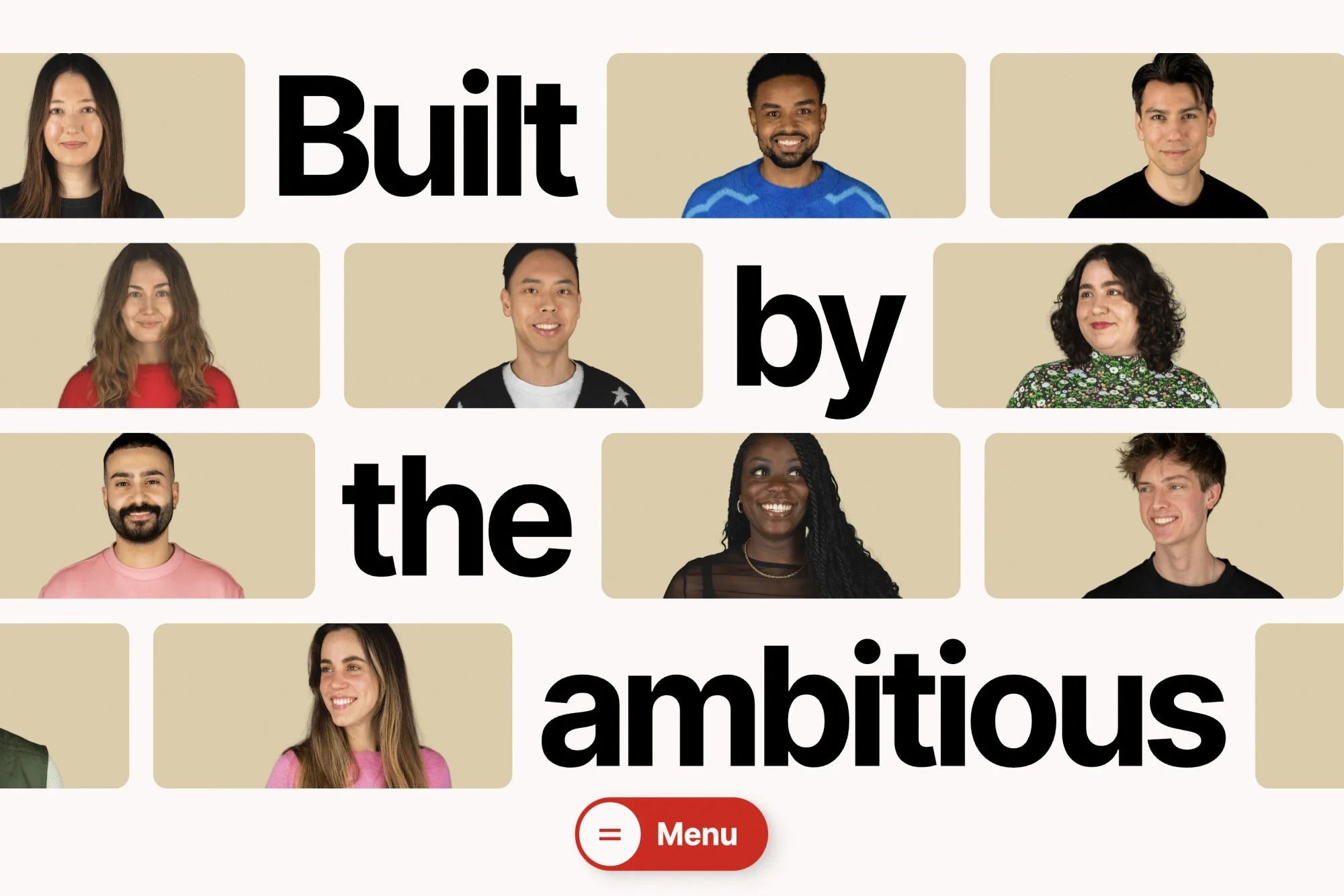 The image presents a clean, modular layout using a light beige background to display text in a bold, black sans-serif font. The design is highly structured and uses a grid of portrait photos paired with large, segmented words to create a cohesive brand statement.